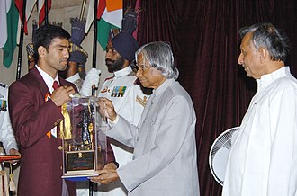 "The President Dr. A.P.J. Abdul Kalam presenting the Arjuna Award -2005 to Shri Akhil Kumar for Boxing, at a glittering function in New Delhi on August 29, 2006. The Union Sports Minister Shri Mani Shankar Aiyar is also seen" by President's Secretariat - GODL-India